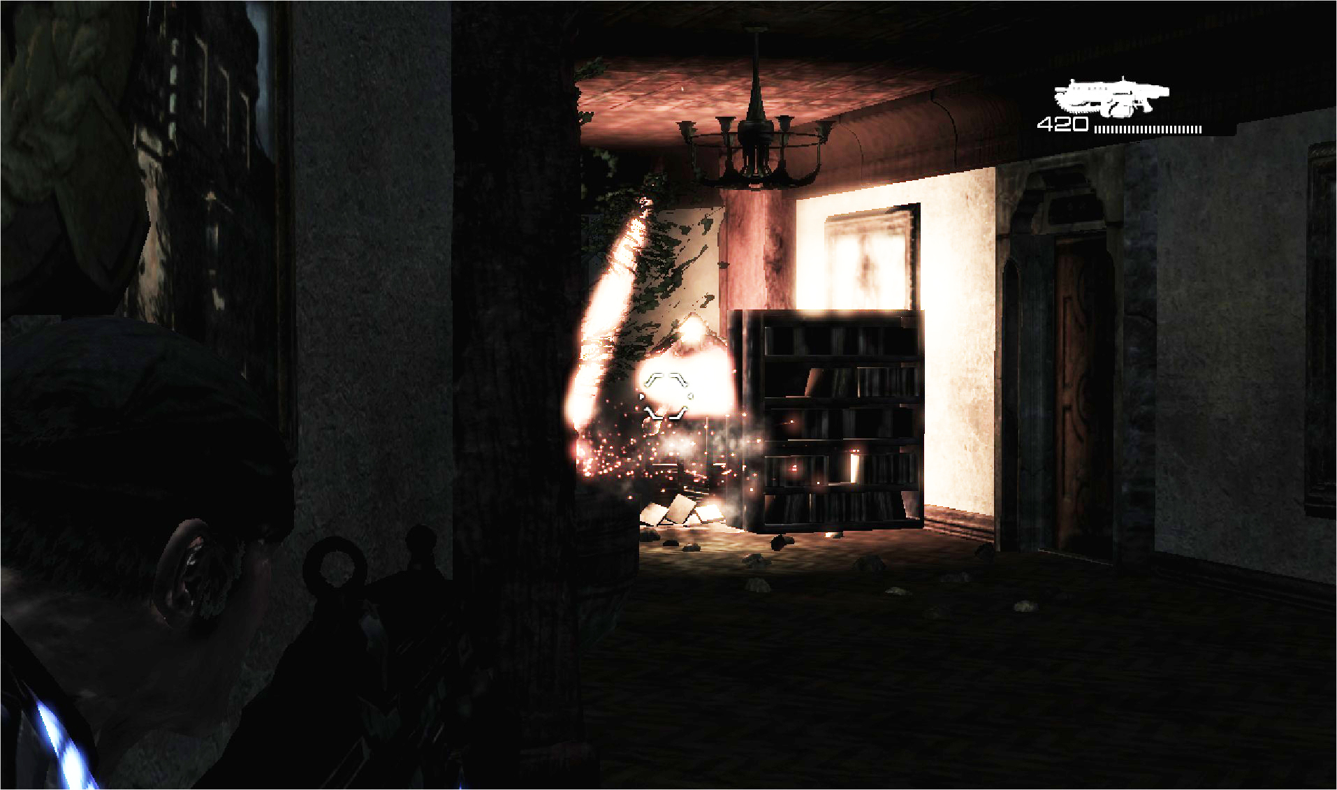 This short hallway Troika encounter first shows the player the danger of the Locust. An abundance of cover and a narrow enemy radius for the turret provide the player with a warmup fight that retains a heroic feeling.