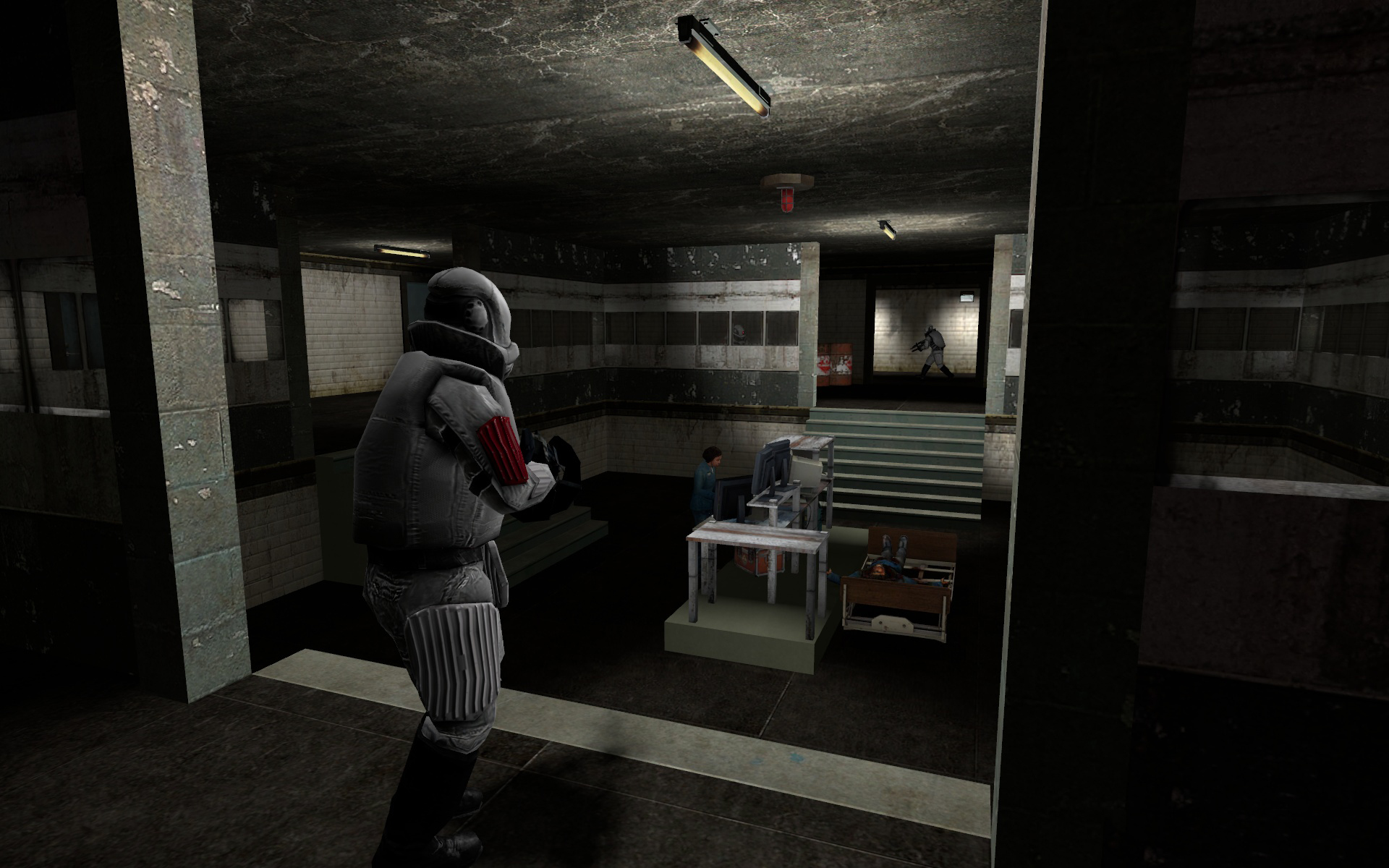 Powerful Combine patrol the halls while the scientists work. The player must recognize patterns in the patrols, find spots to hide in, and avoid or assassinate enemies on his way to the control room.