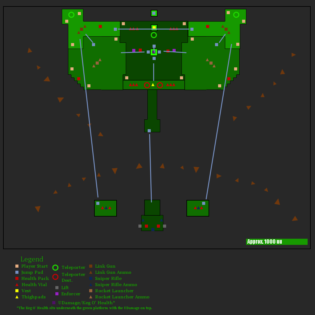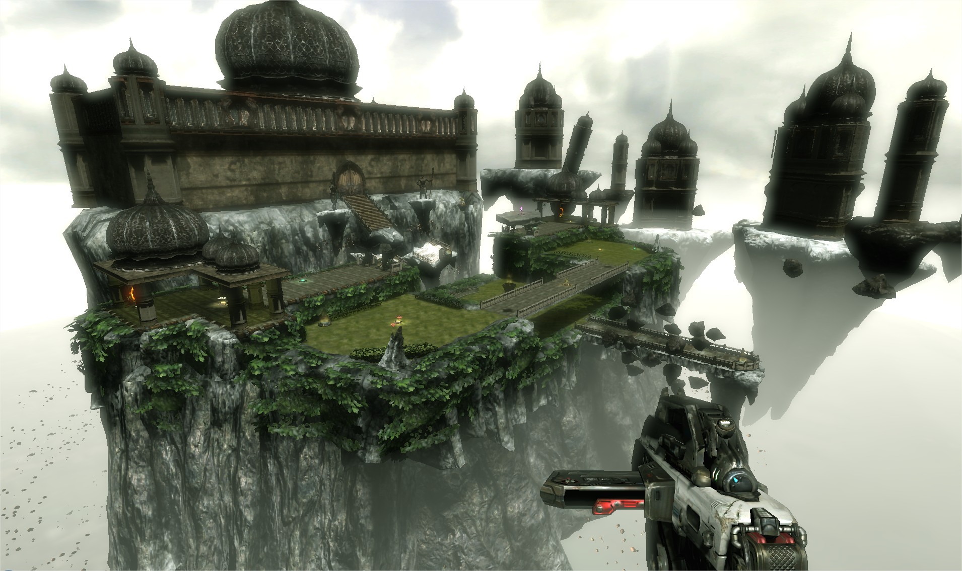 In “Kremlin in the Sky,” Abelev Castle has lifted off, bringing players to a fantastic sky island destination for Deathmatch mayhem! This map, developed in the Unreal Tournament III engine and inspired by the Quake III: Arena classic “DM-17 (The Longest Yard)” brings together 12-16 players for Free-for-All Deathmatch. The playstyle remains frantic and strategic while the idyllic and mystical setting surrounds them.